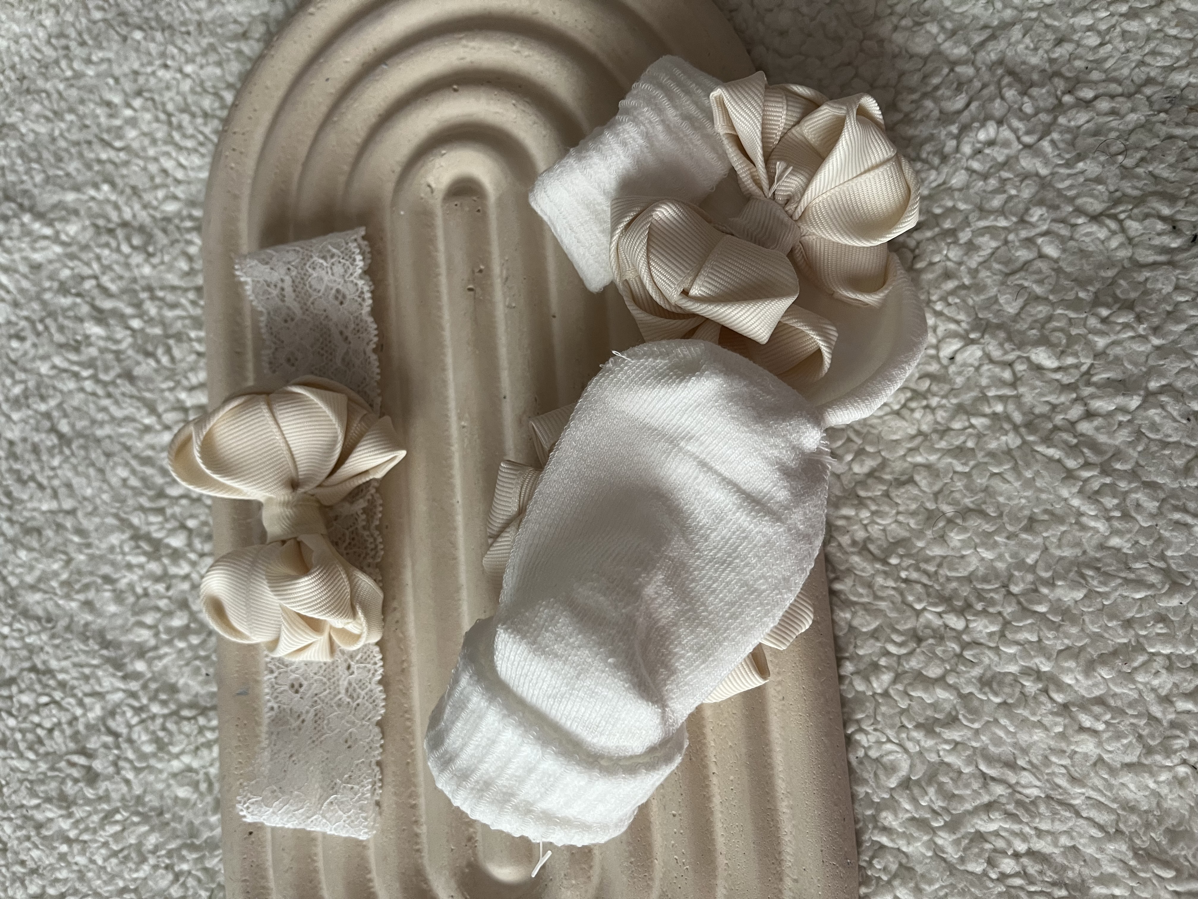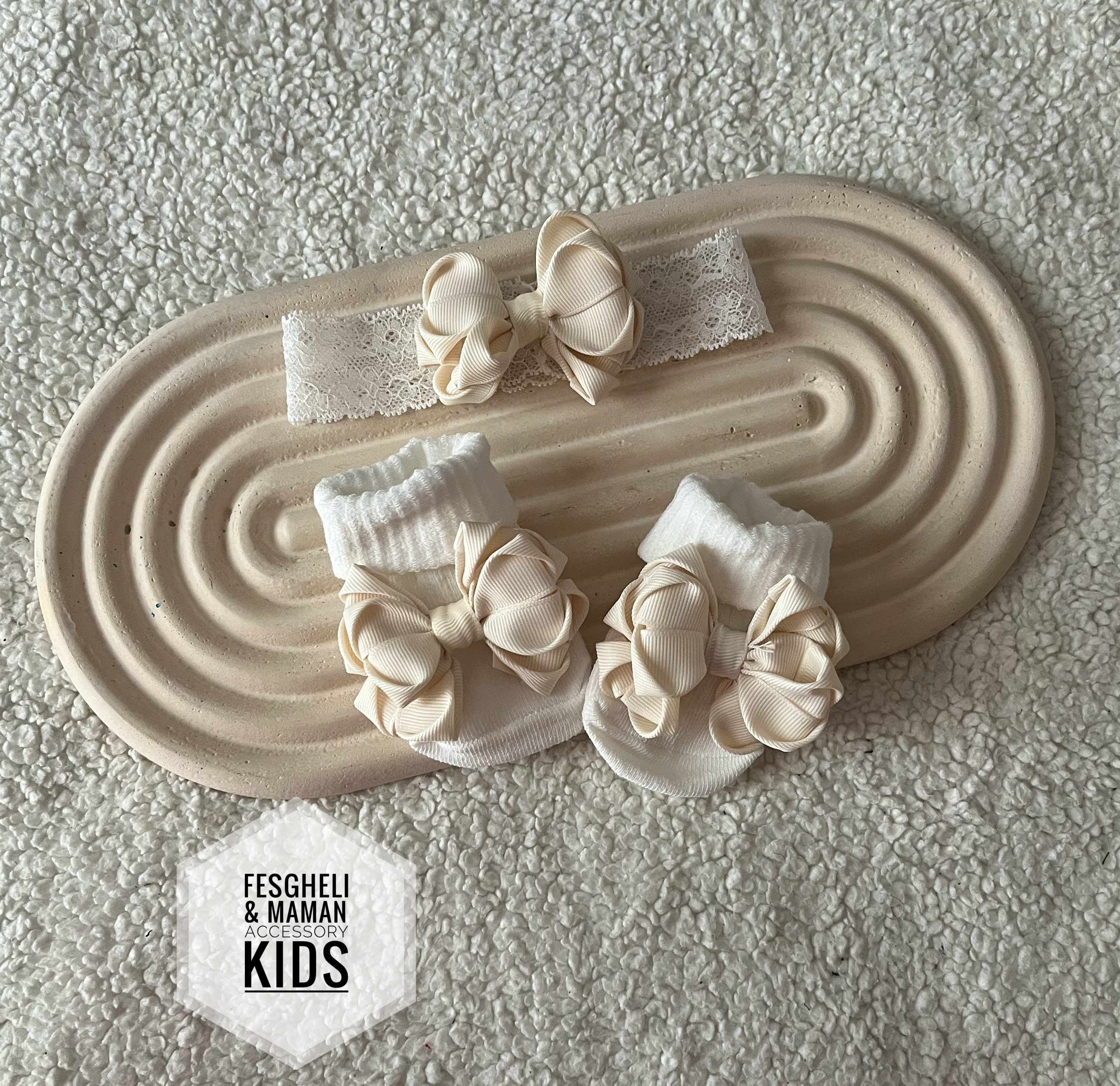 ست جوراب و هدبند پاپیونی در سه رنگ کاربردی جنس هدبند گیپوری جوراب نخ پنبه ساقدار که میتونید تا کنید ساق جوراب رو نوزادی تا ۱۲ ماه